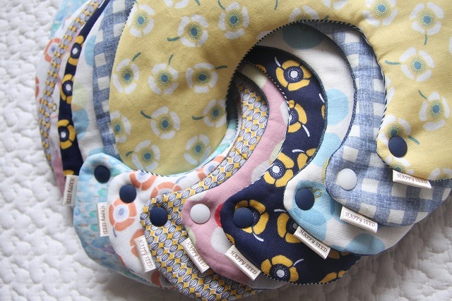 いずれもリバーシブルで、裏側は無地やチェック、ストライプといったシンプルなものにいたしました。